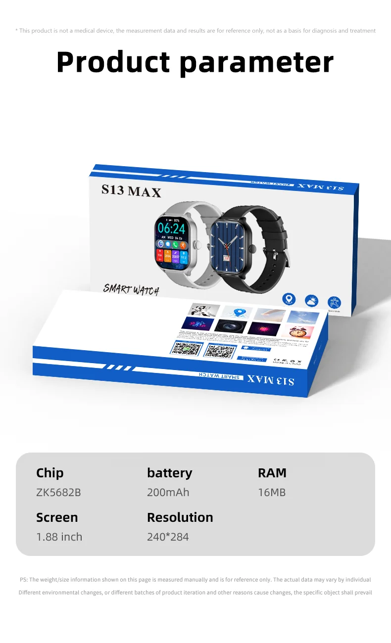 Newest Smart Watch S13 MAX Smartwatch 1.88 HD Display Bluetooth Call Message Alert Sports Mode Smartwatch for Men Women